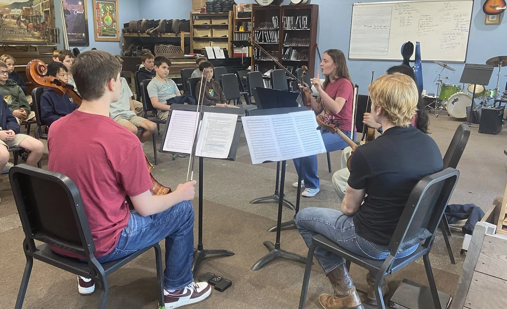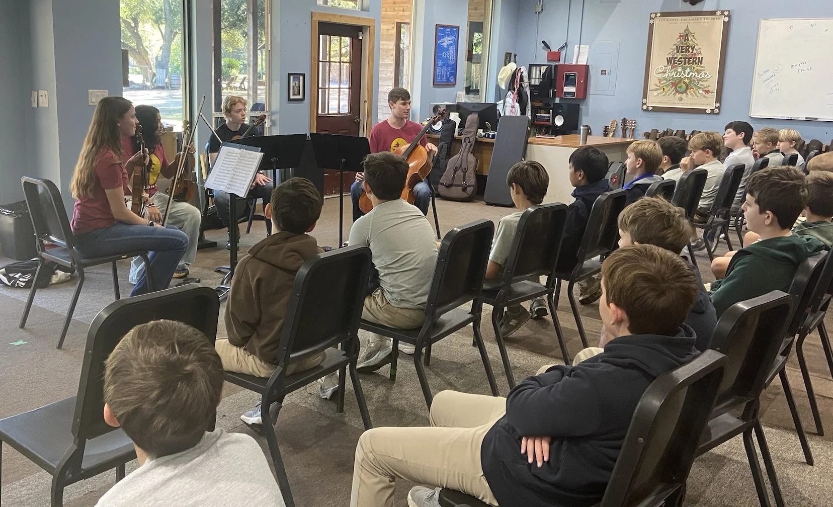 In December, lower school music classes were treated to an excellent string quartet. Dominic Block ('21), playing violin and viola, is a member of the quartet. The senior high school players are students at Kinkaid, St. John's, and Homeschool. In May, Dominic will graduate from Cathedral High School, along with JP England ('22), the first Western boys to do so.